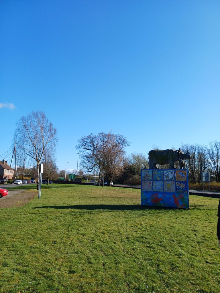 The most direct route back to St Johns follows the cycle path beside the A76. This leads back past lincluden. Be sure to stop and view the unicorn – I mean Rhino – and child. Cuckoo bridge takes you over the A75 and past “the bridge” college buildings. We then walked through Sandside heading for the community gardens. We had been invited to drop in at by a lady volunteers there. I’m sure this haven of community activity will feature in future posts! But on this occasion we enjoyed a brief introduction to the activities before heading back to St Johns to help hang the second Easter stained glass cross in preparation for the Sunday.
