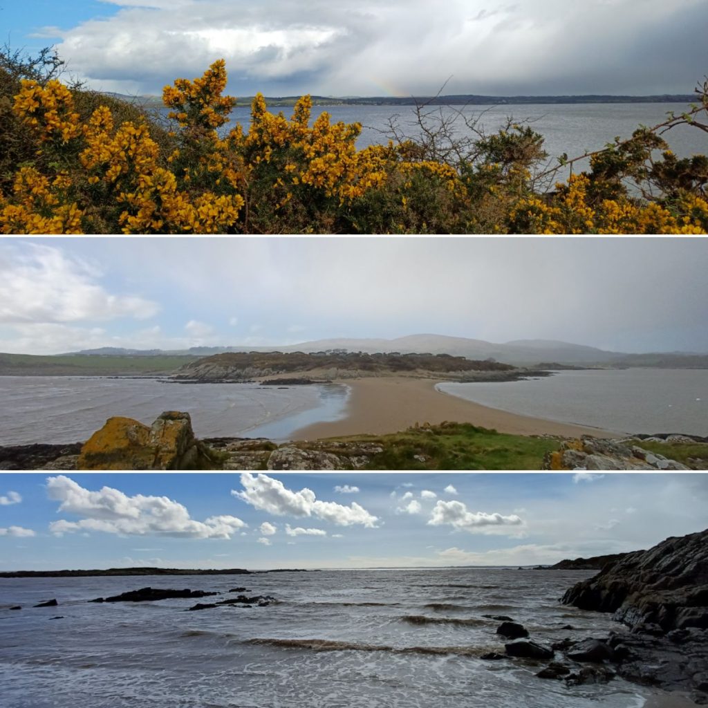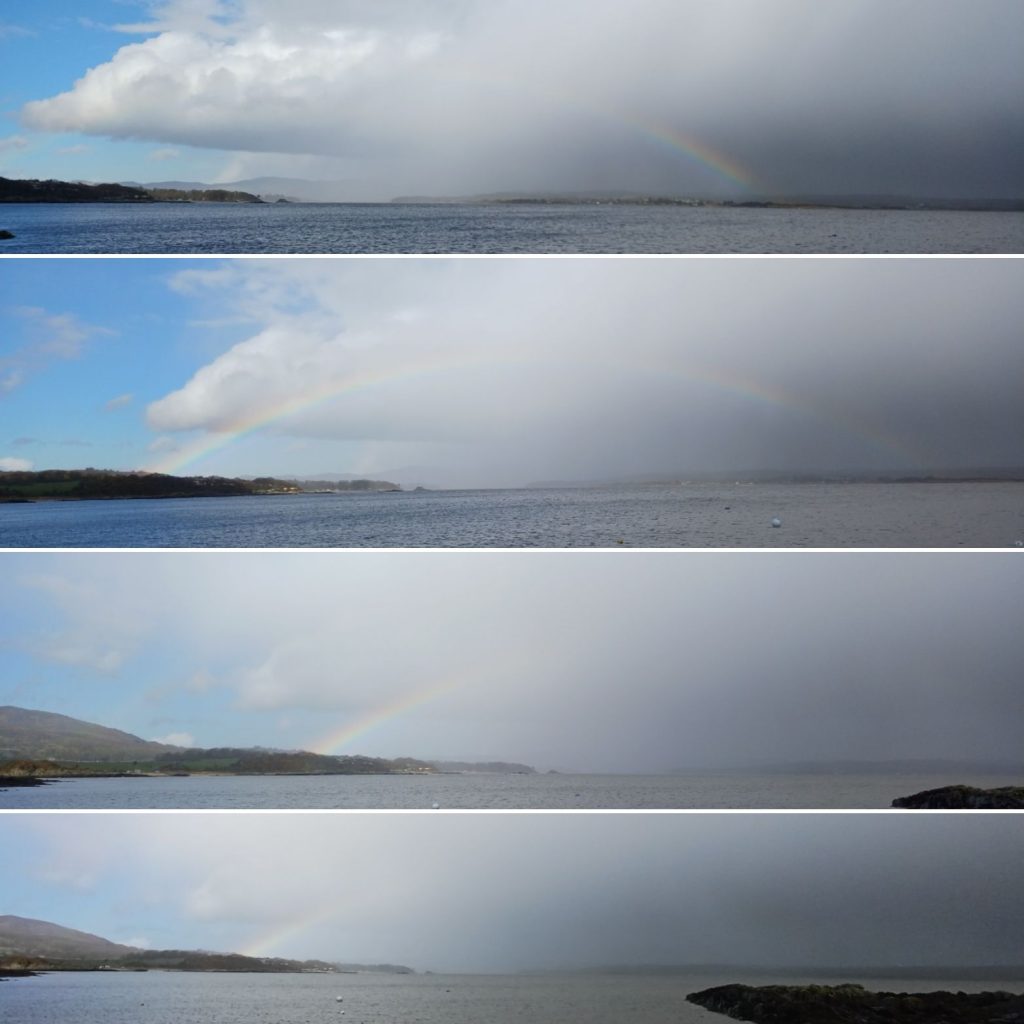 After clearing up I had a moment to walk across the narrow strip of sand, buffeted by the wind with my hood up against the cold rain. On my return I was blessed to watch a rainbow arc across the bay.